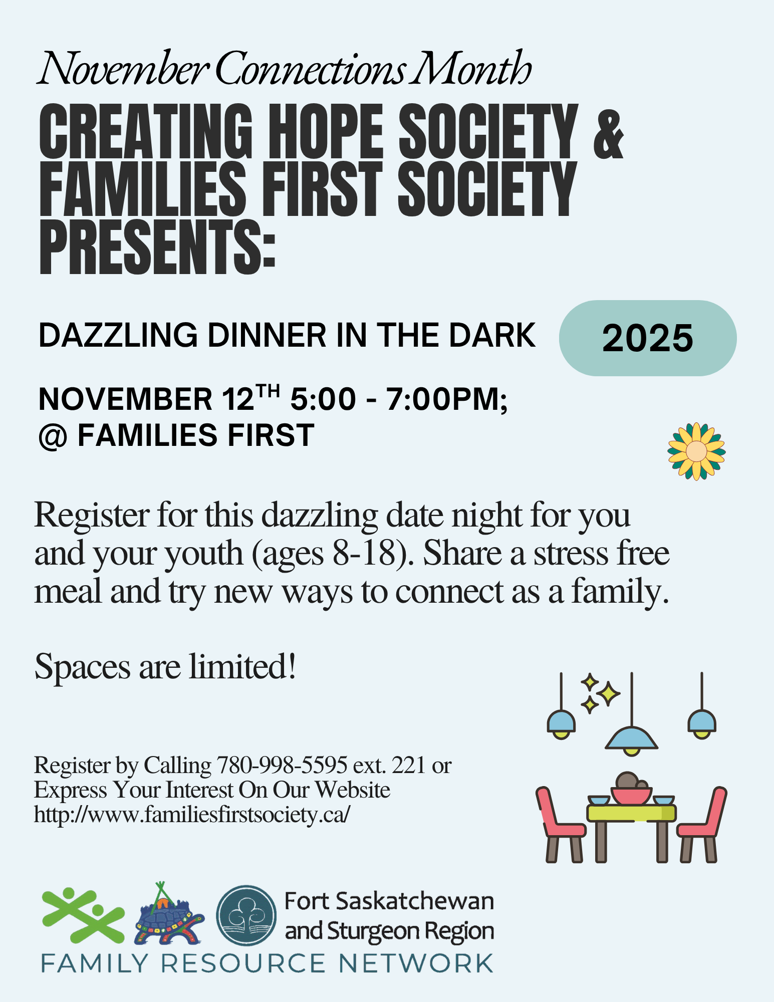 Date: November 12, 2025 Time: 5:00 - 7:00 PM Location: Families First Society (9901 90 Street, Fort Saskatchewan) Join us for this special event for parents/caregivers and their youth (age 8-18 years) for a stress free meal and try new ways to connect as a family. SPACE IS LIMITED! Register by calling: 780-998-5595 x221 OR express your interest by clicking HERE!